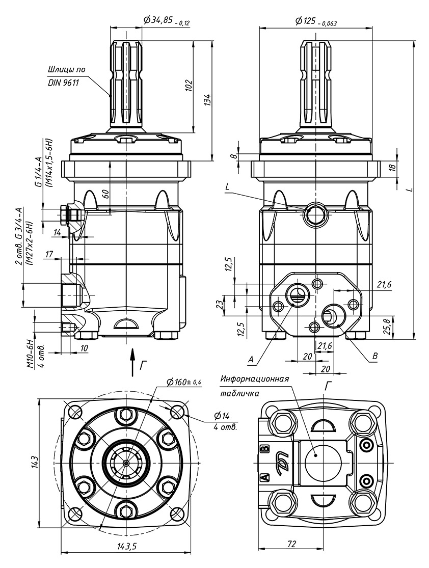 - со шлицевым валом Ф34,85 по DIN 9611 (в обозначении указывается SL).